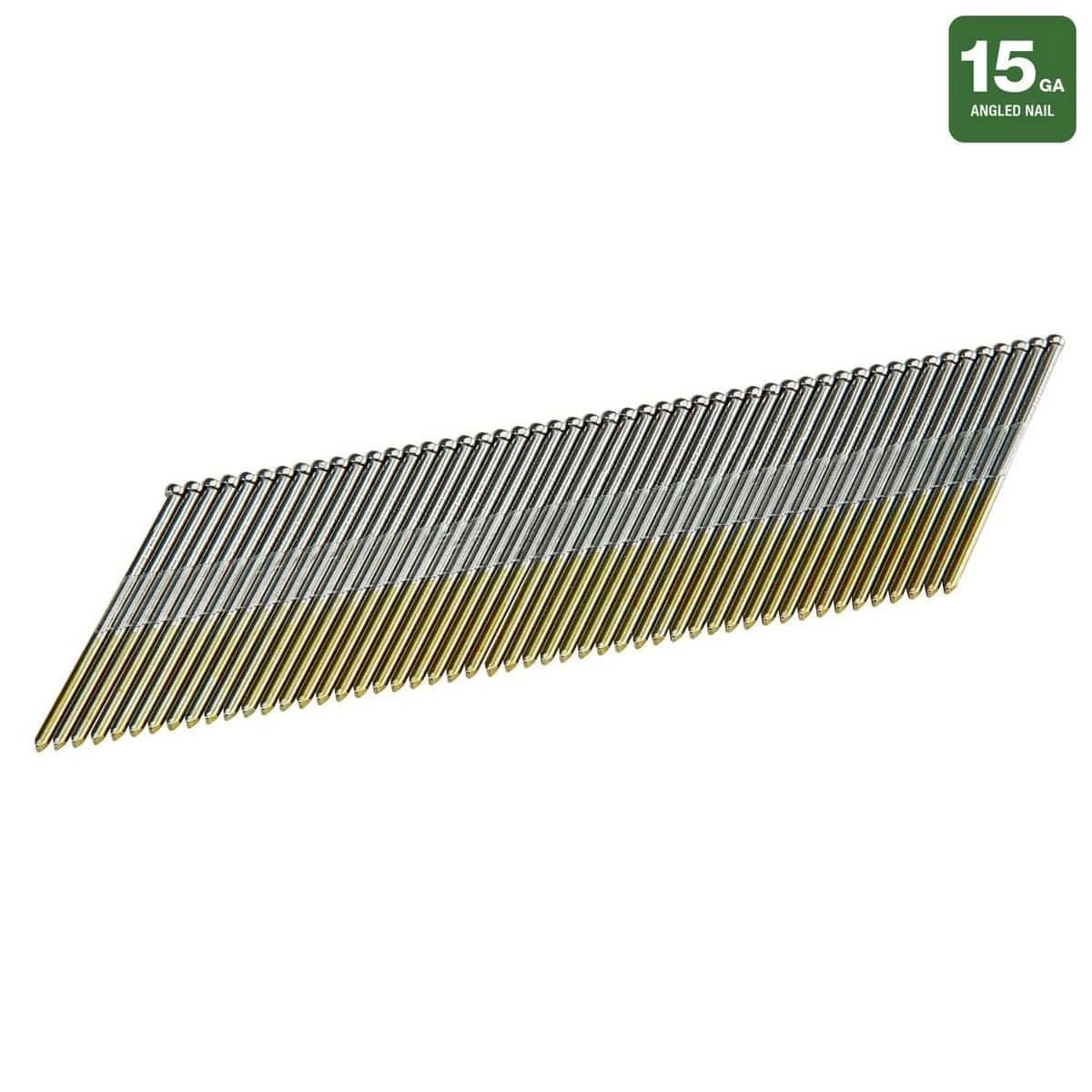 FastenStrong™ finish nails are angled for use in standard 15 GA nailers. The nails feature adhesive collation and a smooth shank.