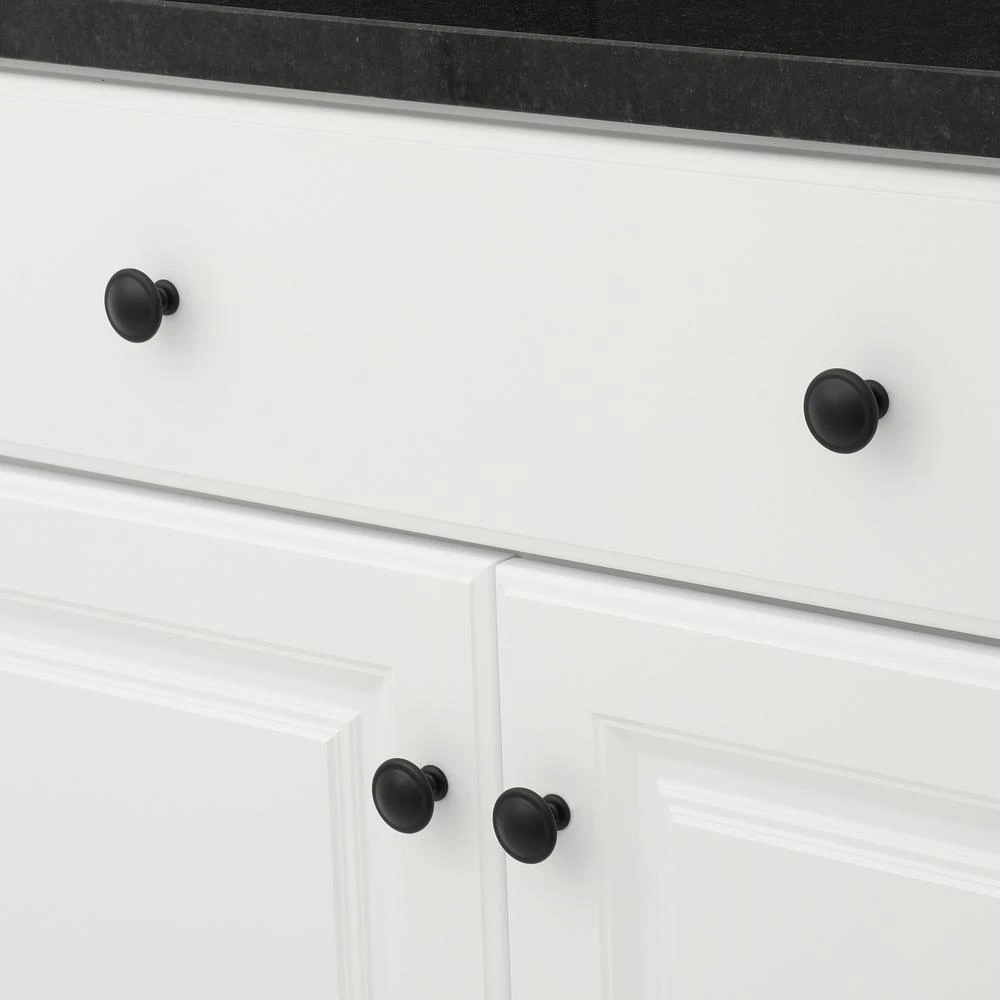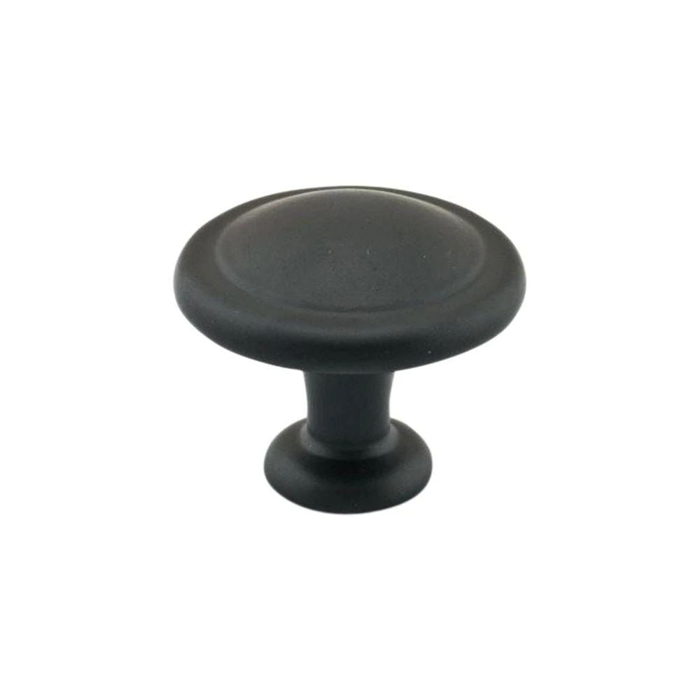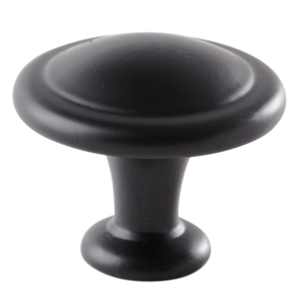 Contemporary 30 mm round knob in a matte black finish. This product works well with contemporary kitchen and bathroom decor. Hardware included.