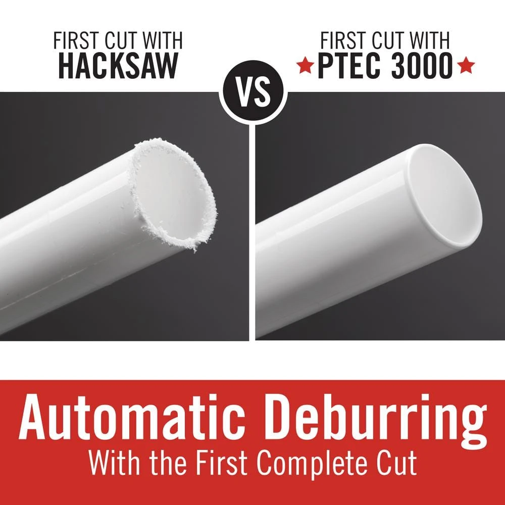 With its innovative design, the RIDGID PTEC 3000 Plastic Drain Pipe Cutter is the first cutter of its kind to execute a clean, fast and straight cut on thin-wall plastic tube. Offering clean, automatic deburring, the cut produced by this pipe cutter results in only a fine strand of plastic, as opposed to the fuzz created around the cut of a hacksaw. You’ll never need a second tool to deburr, as it c. This versatile cutter allows you to cut, deburr and bevel in 1 single step, without deforming the shape of the tube and allowing immediate, easy joining to other sink drain pieces. The PTEC 3000 PVC pipe cutter is designed with an open bore to cut 1-1/2 in. single flange and 1-1/2 in. double flange tailpieces. This PVC pipe cutter effectively cuts polyethylene (PE), polypropylene (PP) and thin-wall PVC tubes.