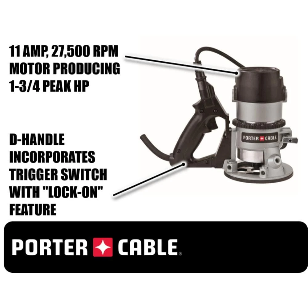 Porter-Cable’s D-Handle, fixed base 1-13/4 HP, 27,500 RPM router is ideal for woodworking, remodeling, trim and home improvement projects. Its D-Handle delivers a low center of gravity and a trigger lock-on feature for increased tool control in hard and soft woods and engineered material like melamine and PVC trim. Macro-adjust the tool with the cam-lock lever for simple edge-forming. Use the micro depth adjustments for bit depth changes accurate to 1/128 of an inch. It accepts collets for 1/4 and 1/2 in. shank bits and features an auto-release collet system minimizing frozen bits. Ninety-day money back guarantee, 3 year limited warranty, 1 year free service contract.