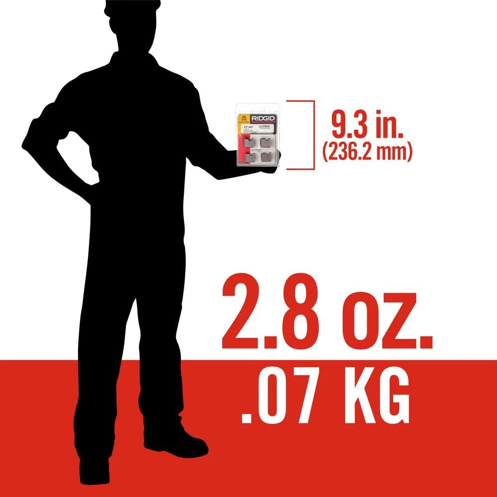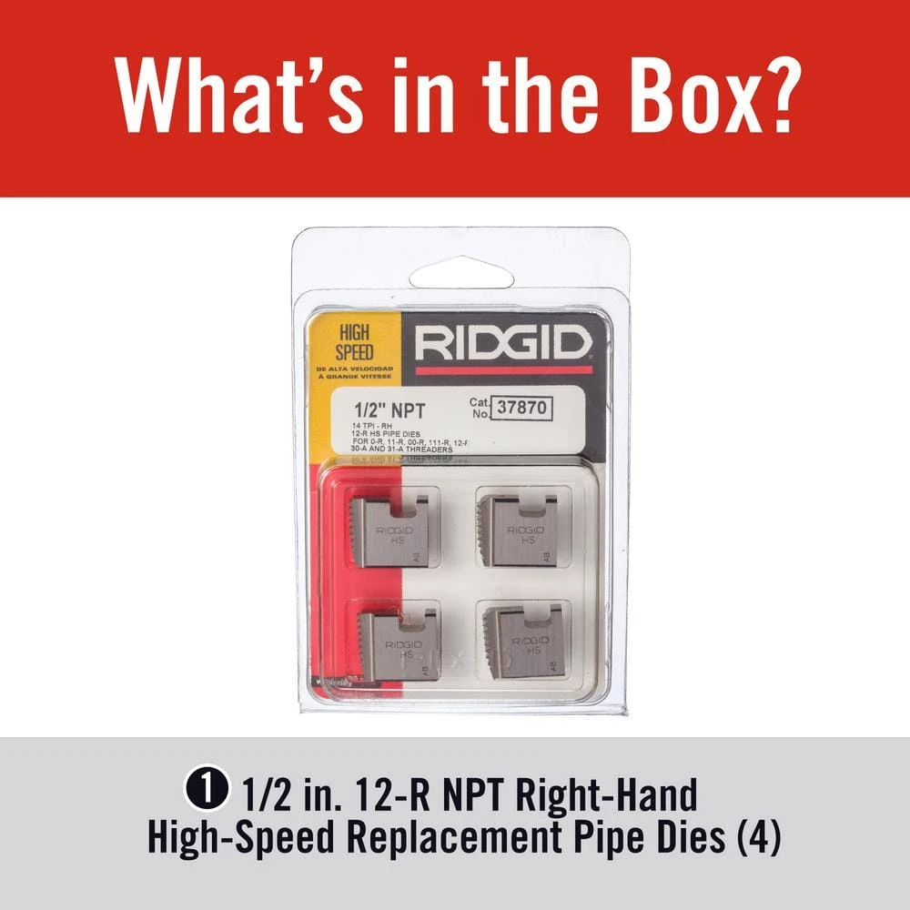 RIDGID pipe dies deliver superior threading performance and capabilities, featuring durable construction to provide long service life and dependable performance. Designed for use in the OO-R, 111-R, 12-R, O-R and 11-R ratchet threaders, the RIDGID 1/2 in. NPT RH High-Speed Replacement Pipe Dies are designed for clean, accurate threading of stainless steel. These super-efficient replacement high-speed NPT dies are designed for 1/2 in. nominal pipe. The right-hand direction cutting motion delivers 14 TPI.
