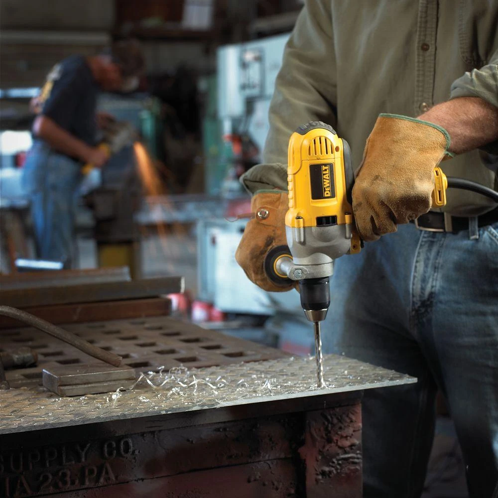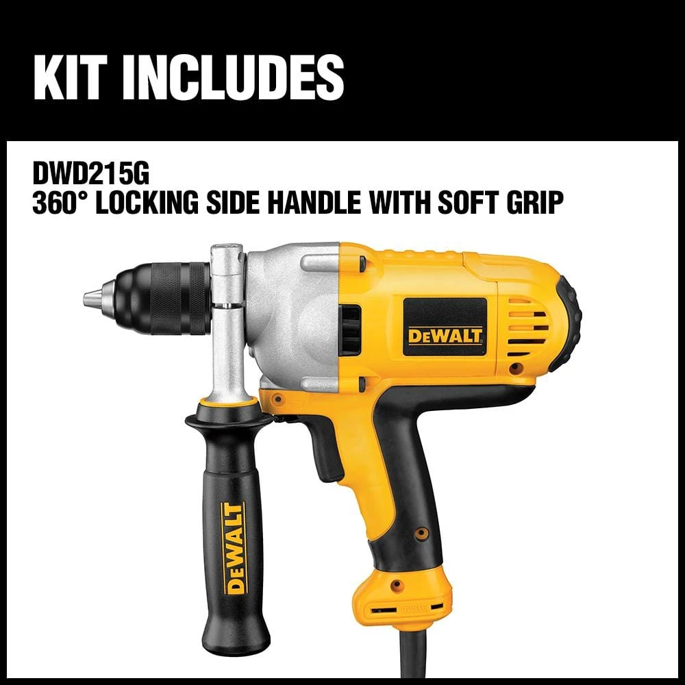 The DEWALT DWD215G’s 10 Amp motor delivers increased drilling performance. The patented motor design generates 50% more power with increased overload protection for added durability. The 1/2 ft. all-metal single-sleeve ratcheting keyless chuck with automatic spindle lock provides greater bit retention and tool-free convenience, and the metal gear housing provides jobsite durability and increase reliability. The drill has 0-1200 RPM and variable speed reversing switch for increase versatility. The DWD215G includes a 360° locking side handle with soft grip.