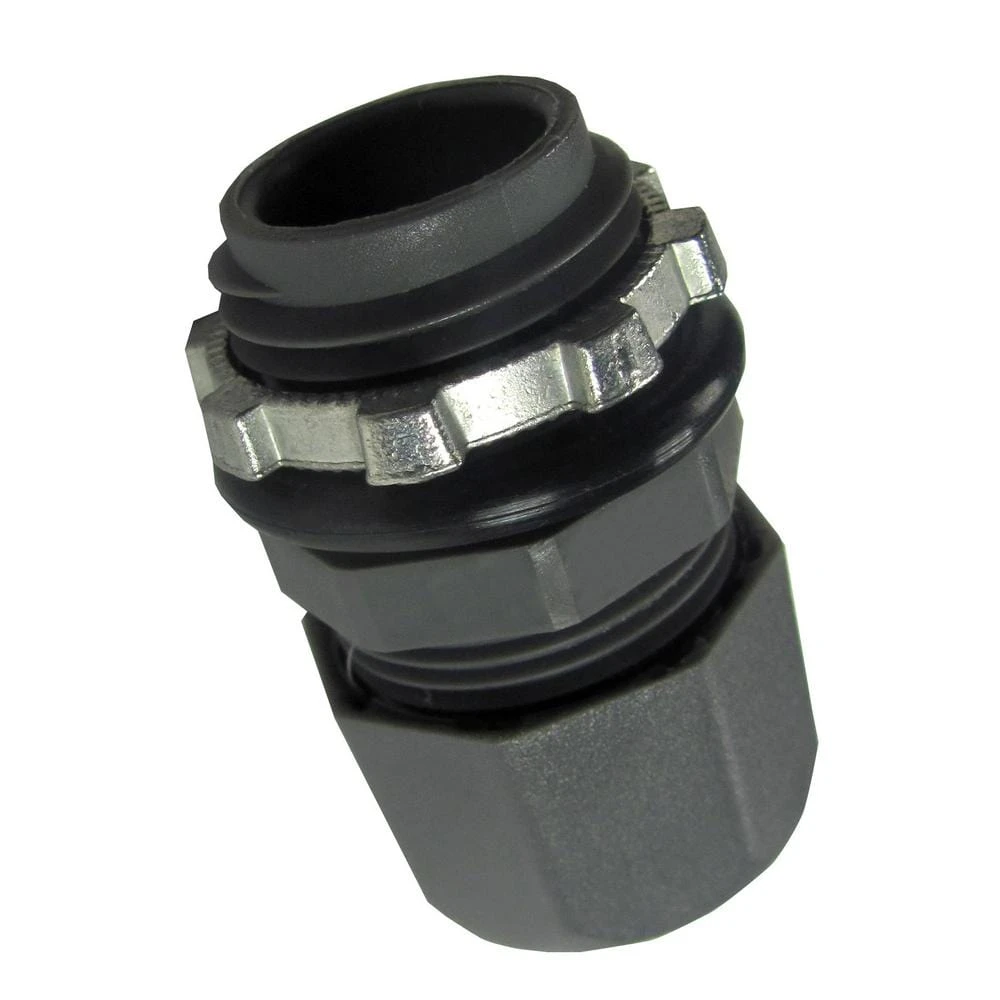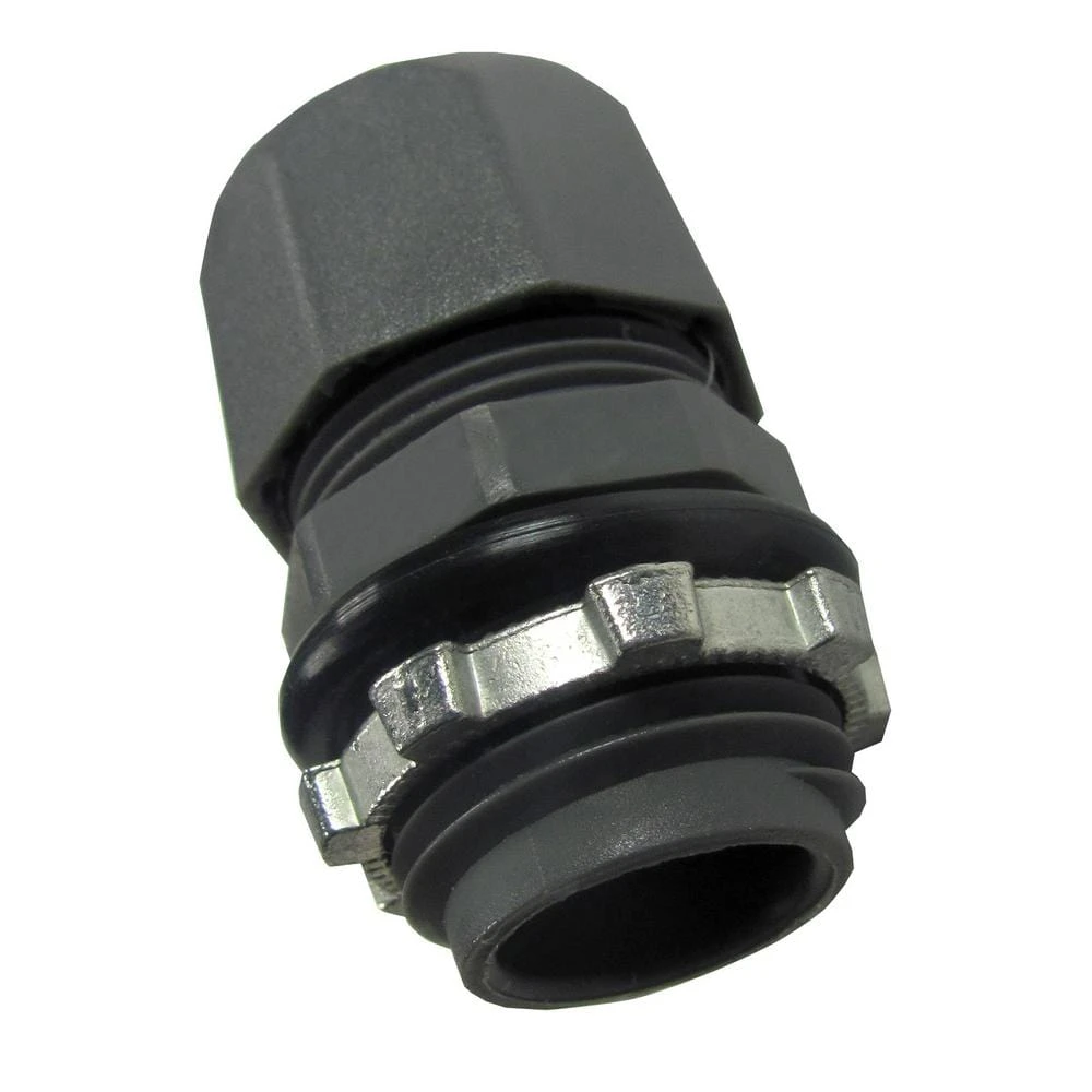 The Halex 1/2 in. ACC Non-Metallic Strain Relief Cord Connector is intended for indoor applications and is UL and CSA safety listed. This standard fitting is made of plastic and is for use with galvanized rigid conduit.