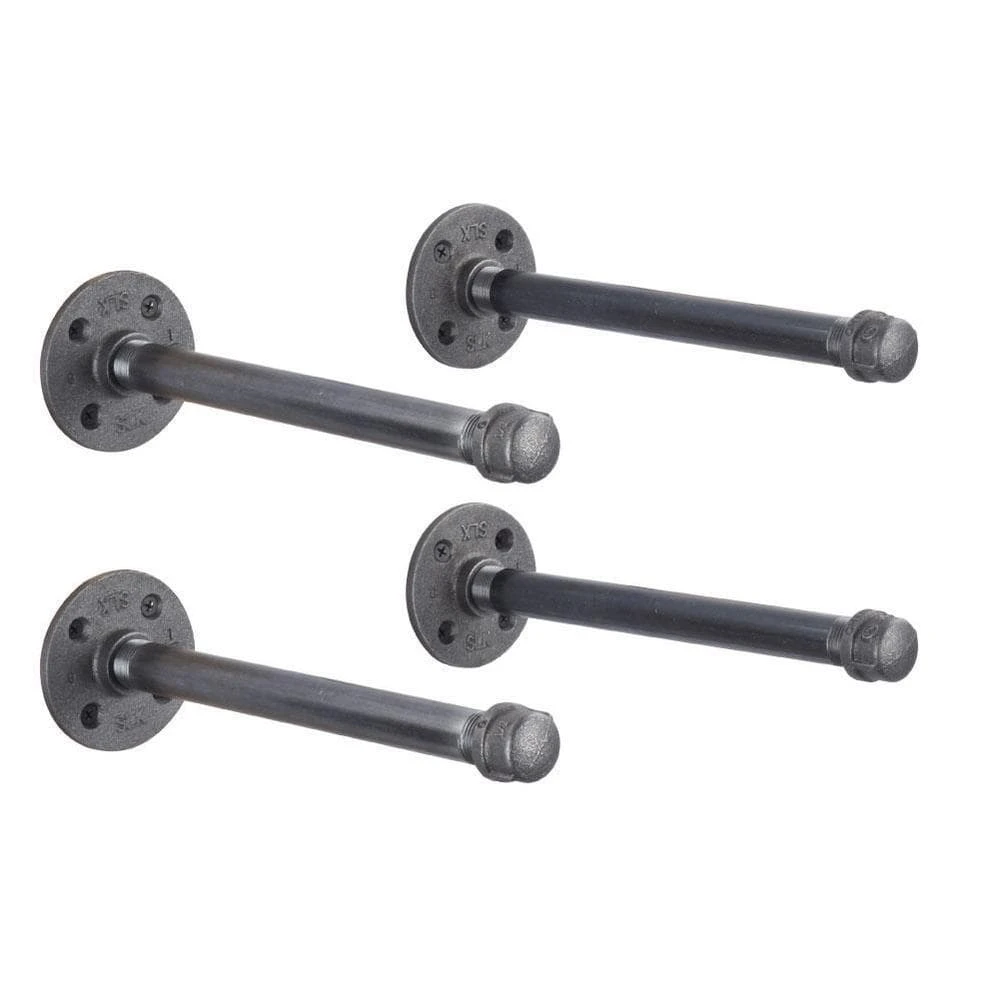 Pipe Decor, 10 in. straight industrial shelf brackets in a set of four. Add eye-catching style to your new set of shelves with these heavy-duty, pipe shelving brackets. Cast iron fittings and black steel pipe pair impeccably with woods of various colors and sizes. Treat your visitors to your sense of style and attention to detail. These Pipe Decor brackets fit a surprising number of looks and aesthetics, including steampunk lighting, industrial, factory, French country farmhouse, vintage, retro reclamation, and D-I-Y. You will know Pipe Decor parts and accessories when you hold them. Beauty and beast. Strength and style. This is real industrial pipe for your creative design needs. Accept no substitutes. All our pipe and fittings come coated in a light industrial grease to prevent rusting. Clean and seal each piece, before assembly, to ensure that they stay rust-free. After cleaning, seal the pipe with polyurethane spray to protect it from rust and scratches.