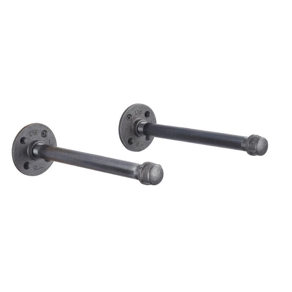 Pipe Decor, 12 in. straight industrial shelf brackets in a set of two. Add eye-catching style to your new set of shelves with these heavy-duty, pipe shelving brackets. Cast iron fittings and black steel pipe pair impeccably with woods of various colors and sizes. Treat your visitors to your sense of style and attention to detail. These Pipe Decor brackets fit a surprising number of looks and aesthetics, including steampunk lighting, industrial, factory, French country farmhouse, vintage, retro reclamation, and D-I-Y. You will know Pipe Decor parts and accessories when you hold them. Beauty and beast. Strength and style. This is real industrial pipe for your creative design needs. Accept no substitutes. All our pipe and fittings come coated in a light industrial grease to prevent rusting. Clean and seal each piece, before assembly, to ensure that they stay rust-free. After cleaning, seal the pipe with polyurethane spray to protect it from rust and scratches.