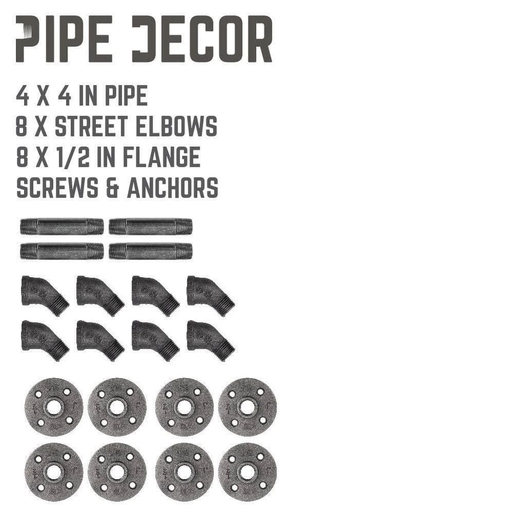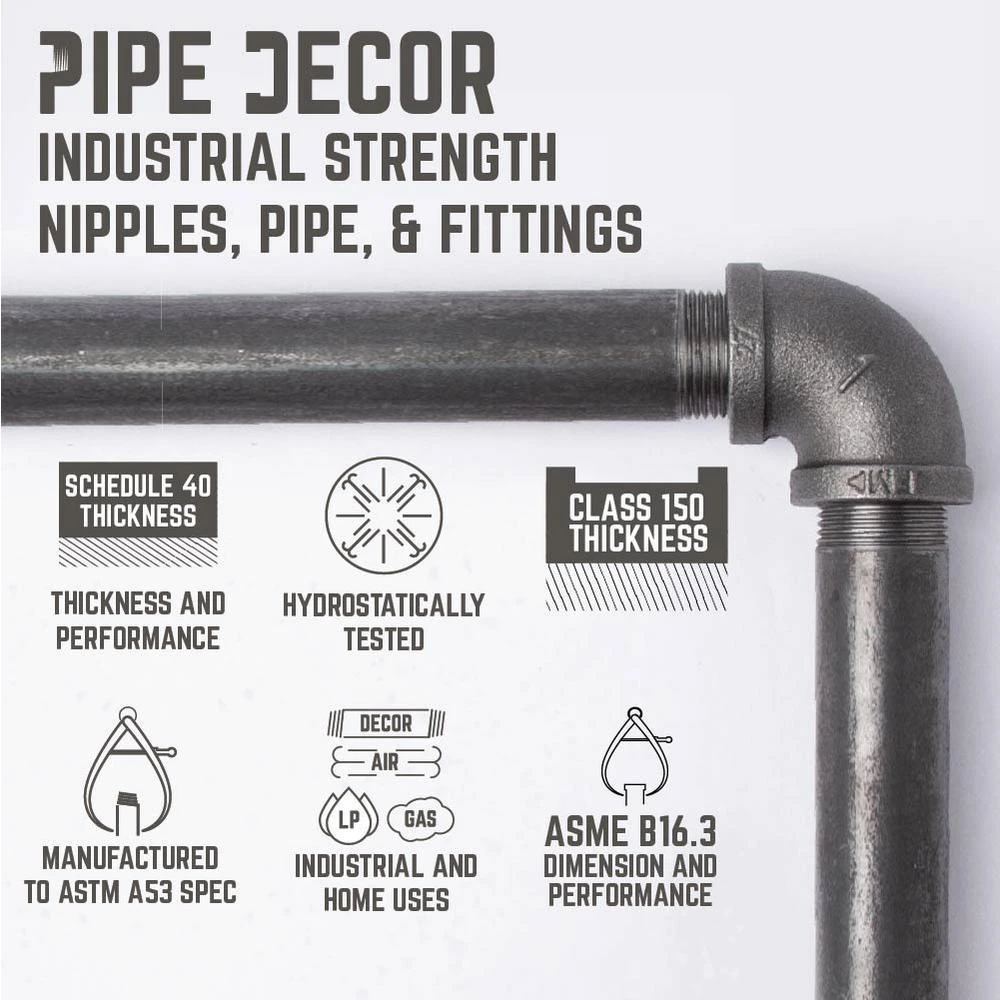 Add eye-catching style to your new set of shelves with these heavy-duty, pipe shelving brackets. Cast iron fittings and black steel pipe pair impeccably with woods of various colors and sizes. Treat your visitors to your sense of style and attention to detail. These Pipe Decor brackets fit a surprising number of looks and aesthetics, including steampunk lighting, industrial, factory, French country farmhouse, vintage, retro reclamation, and D-I-Y. You will know Pipe Decor parts and accessories when you hold them. Beauty and beast. Strength and style. This is real industrial pipe for your creative design needs. Accept no substitutes. All our pipe and fittings come coated in a light industrial grease to prevent rusting. Clean and seal each piece, before assembly, to ensure that they stay rust-free. After cleaning, seal the pipe with polyurethane spray to protect it from rust and scratches.