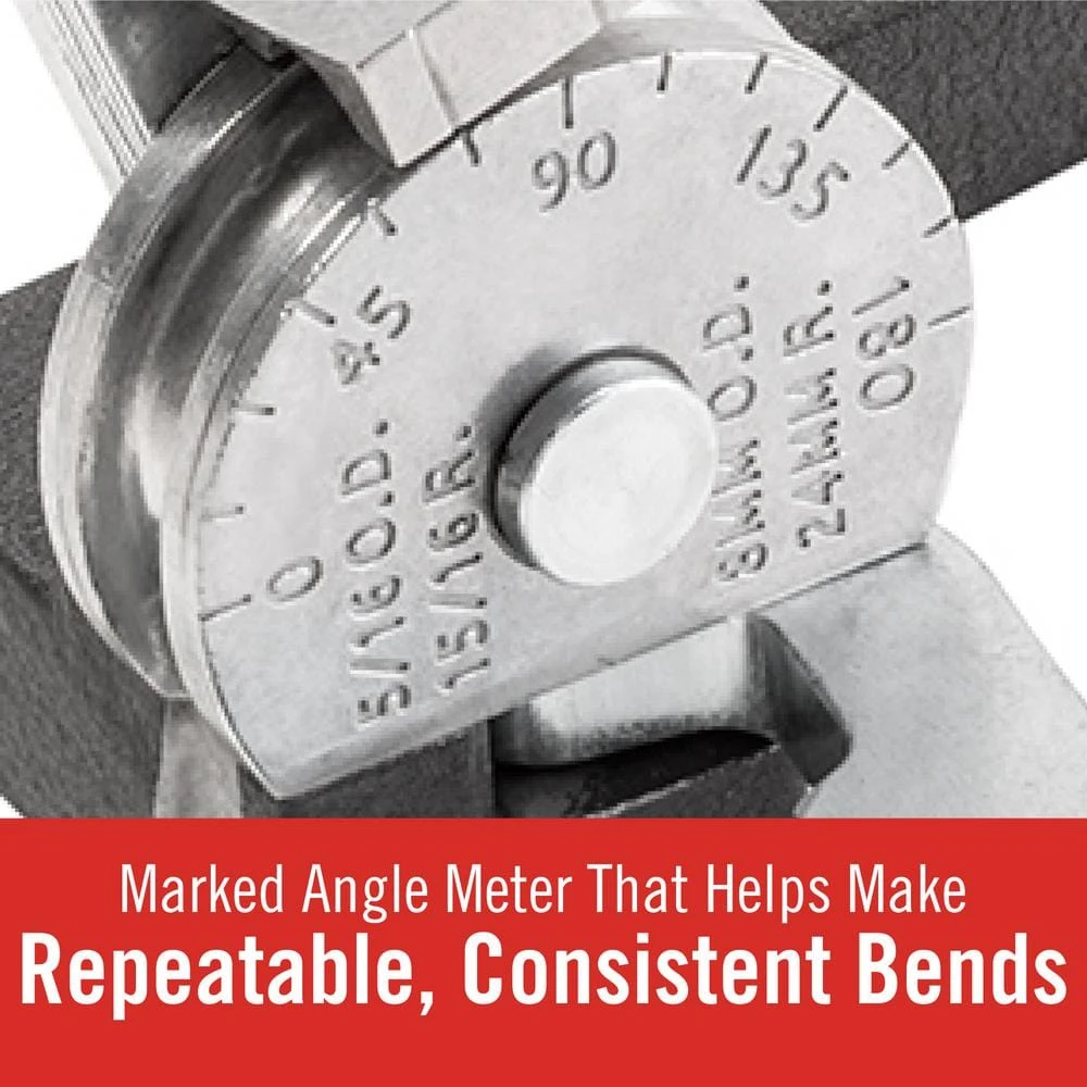 - Pipe bender has a marked angle meter that lets you make repeatable, consistent bends with clearly marked 15° increments