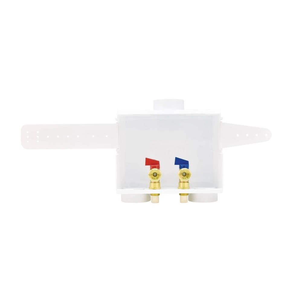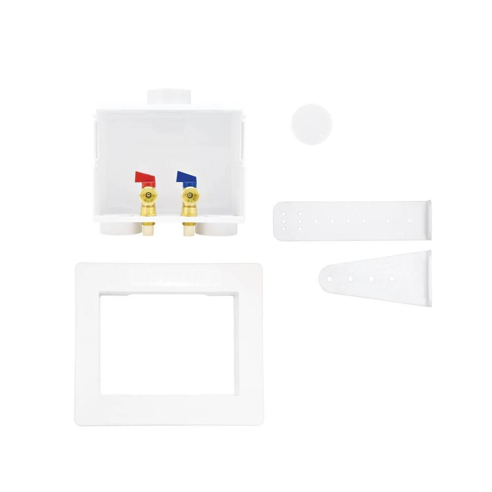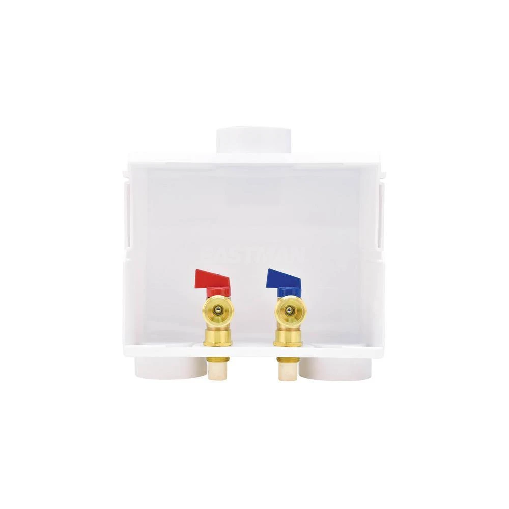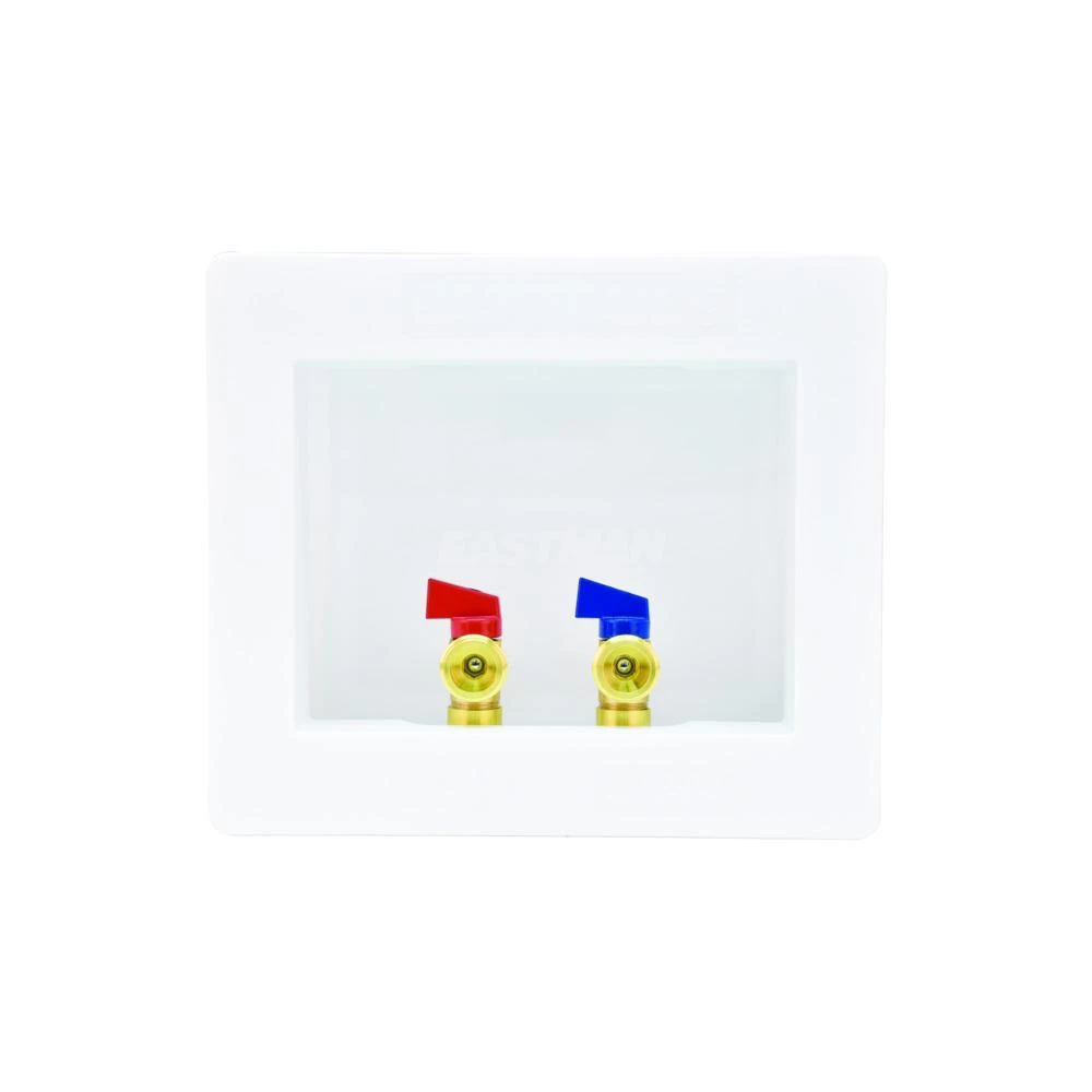 The Eastman Dual Outlet Washing Machine Outlet Box is designed for recessed residential applications. The outlet box comes complete with hot and cold valves installed, support bracket, and faceplate cover. This outlet box is built with 1-piece construction and a raised drip guard that prevents potential leaks.