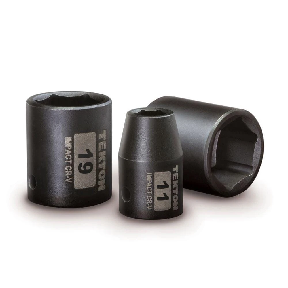 Built for use with impact tools, the TEKTON 1/2 in. Drive Shallow Impact Sockets fit in tight spaces to effortlessly break free rusty suspension and exhaust bolts, quickly remove stuck lug nuts, and loosen crank bolts with ease. TEKTON impact sockets efficiently transfer torque from impact wrench to fastener, loosening the most stubborn nuts and bolts. Made from high-strength chrome vanadium steel, our impact sockets are more resistant to drive end round out than standard impact sockets, resulting in a longer useable life. TEKTON impact sockets meet or exceed ANSI performance standards. The high-torque, 6-point socket grips the broad, flat sides of nuts and bolts, not just the corners, so there is no need to worry about stripping fastener head or damaging socket. The shallow socket design allows access to fasteners in tight spaces. Even in low light, the high-contrast, permanent laser etched size markings are easy-to-read. The customized red TEKTON case can be stored in a tool chest or carried to your job site. Molded size markings keeps set organized and identifies any missing sockets.