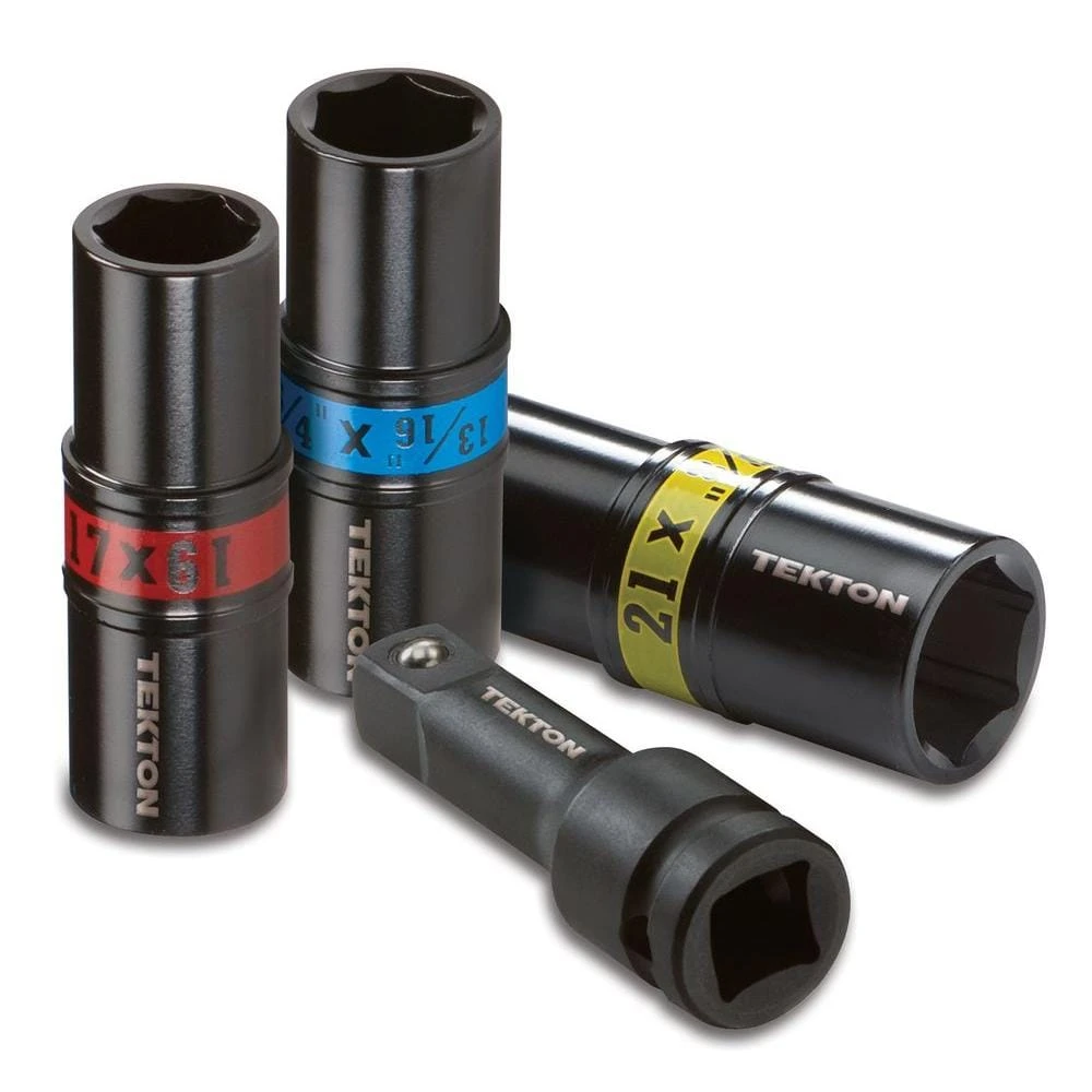 Built for use with impact tools, the TEKTON 4-pc. 1/2 in. Drive Impact Flip Socket Set includes the six most common sizes for lug nuts. The six-point design offers a snug fit and sure contact with the broad, flat sides of a lug nut, not just the corners, preserving its geometry and preventing round-off. Thinner walls give sockets the clearance to slide into tight recessed wells where many other impact sockets can’t go. Made of forged and hardened chrome molybdenum steel, each socket has a durable black electroplated finish. Color coding allows for quick size identification.