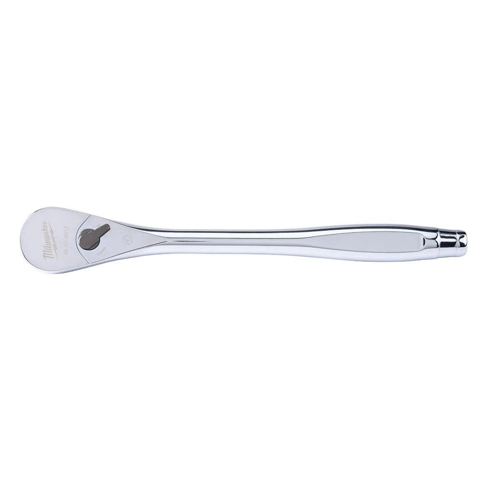 The Milwaukee 1/2 in. Drive Ratchet offers you just 4° of arc swing, allowing access to work in tighter spaces. The drive ratchet features a slim profile design and flush directional lever for better accessibility. The 90° tooth ratchet delivers greater fastener access and an increase in strength during heavy-duty applications thanks to its durable construction. The all-chrome finish provides the ratchet with easy-cleaning and a professional look. The 1/2 in. ratchet is backed by a lifetime guarantee.