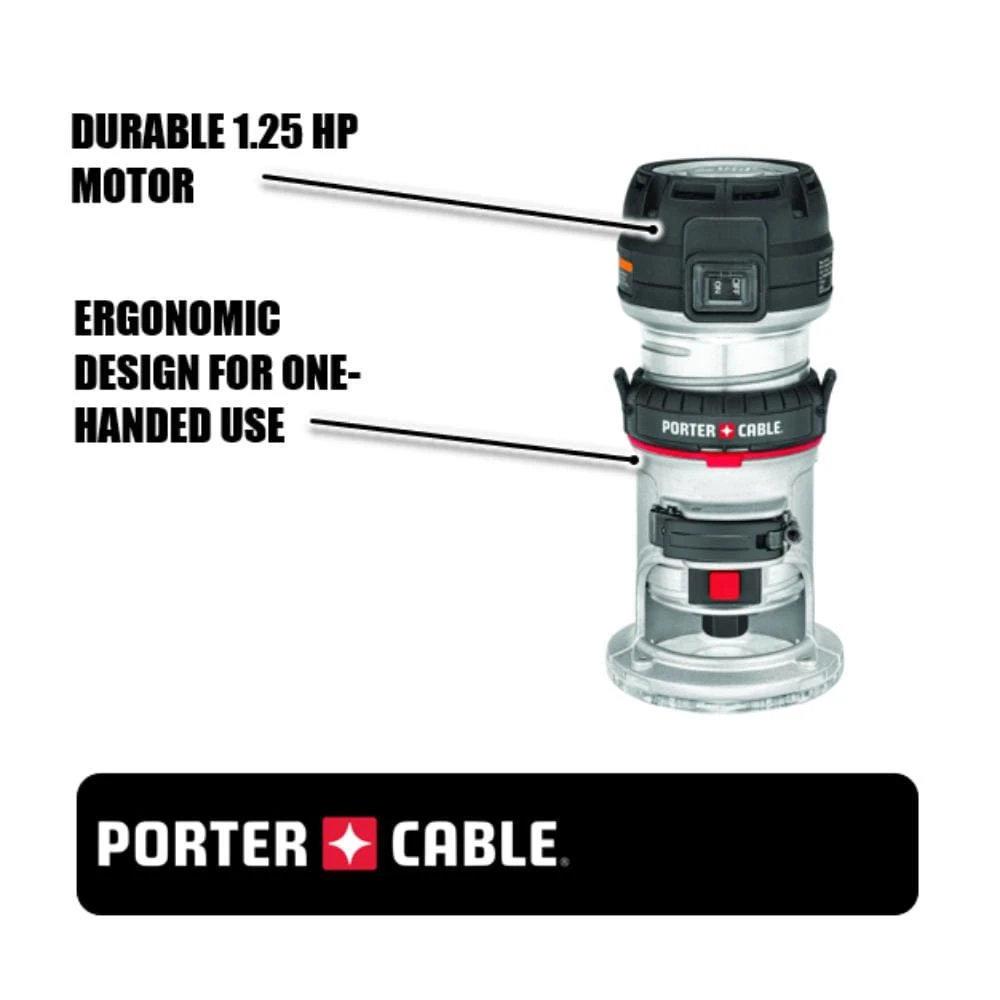 The Porter Cable 450 1.25 HP Max Torque Compact Router is ergonomically designed for a comfortable, one-handed use. The 1.25 horse power provides the power for the toughest application along with the soft-starting motor allowing the motor to maintain speed throughout the cut. The large, low-pressure spindle lock button with multiple shaft-lock detents allows for quick and comfortable, single wrench bit changes. The spring-loaded release tab allows for quick base removal while the adjustment ring enables controlled bit depth changes to within 1/64 in. The 450 includes: motor, standard base and wrench.
