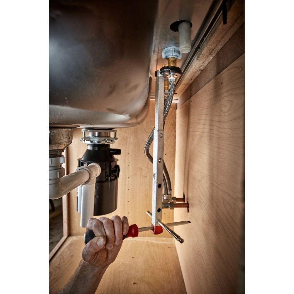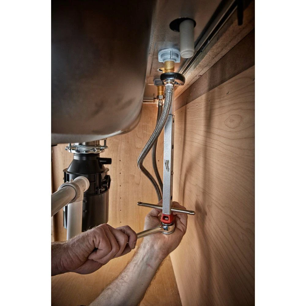 The Milwaukee 1.25 in. Basin Wrench is designed for the industry’s easiest basin swap-out in under sink applications and extremely tight spaces. The Milwaukee Basin Wrench features an ergonomic handle, designed to fit in the palm for maximum efficiency and comfort. A new-to-world ratchet ready and screwdriver ready handle allows for maximum speed and break-away torque for difficult to remove or corroded fasteners. Featuring a forged and hardened jaw with an optimized tooth pattern, the Milwaukee Basin Wrench provides maximum grip and durability. The telescoping handle is designed to allow for easy adjustment between handle lengths.