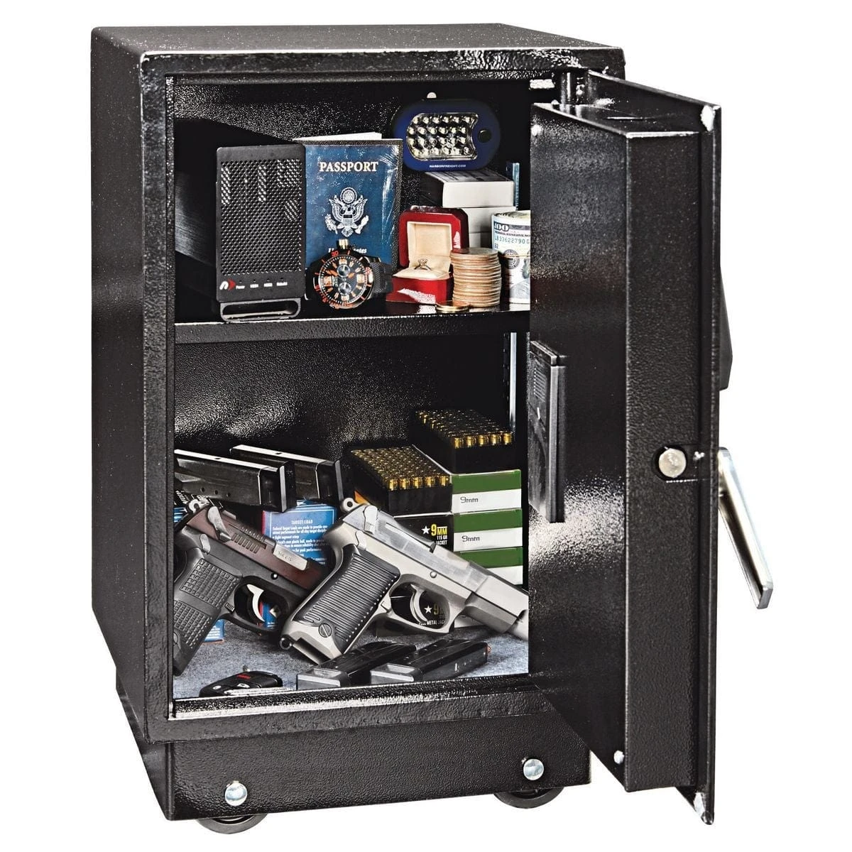 This heavy-duty electronic floor safe is built with heavy gauge steel plate to provide rock-solid security for your valuables. Certified by the California Department of Justice for use as a firearm safe, this heavy gauge floor safe has a removable shelf for documents and other valuables. The dual-entry lock permits entry through a digital keypad but has a keyed override to prevent lock-out if you forget the code. The digital floor safe has tamper-proof hinges and heavy gauge bolts to prevent break-in. Removeable casters make the electronic floor safe easy to position. Comes with hardware for permanent mounting.