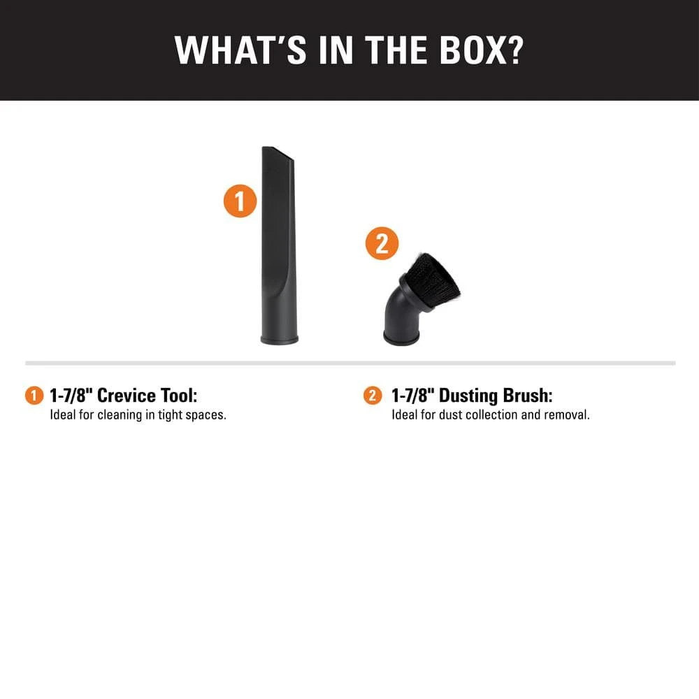 RIDGID offers a variety of vacuum attachments to make clean-up easier. The 1-7/8 in. Crevice Tool and Dusting Brush are designed with functionality and long-lasting durability in mind. Both vac nozzles are highly versatile and allow you to tackle a wide range of cleaning activities more effectively and efficiently, particularly useful when cleaning car interiors such as dashboards and in between seats.