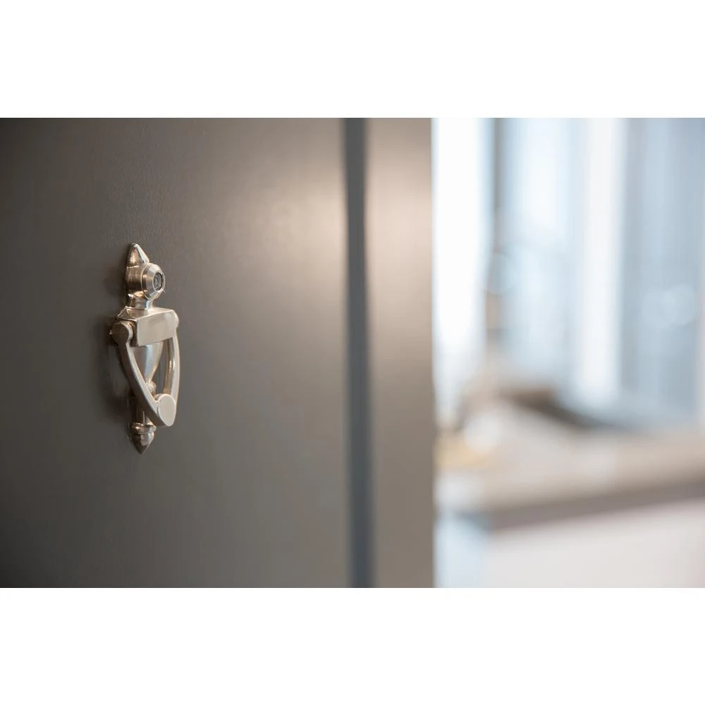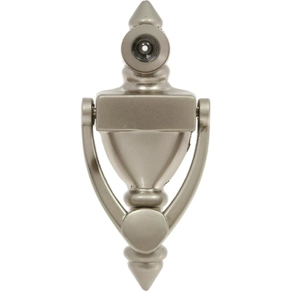Delaney Hardware 4 in. Door Knocker with 160˚ Viewer. Durable brass construction in satin nickel finish. Designed to complement and increase the functionality of your entryway.