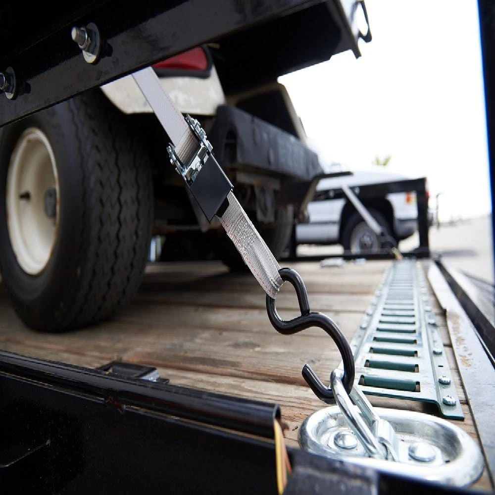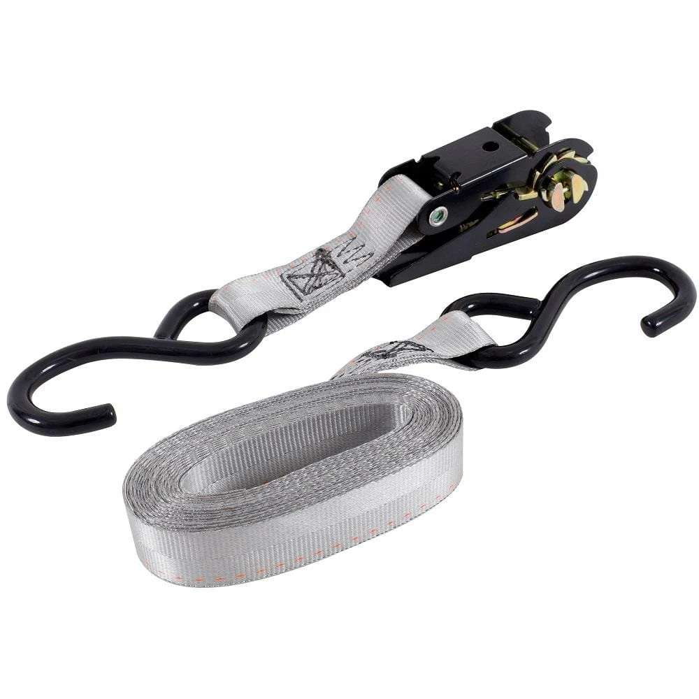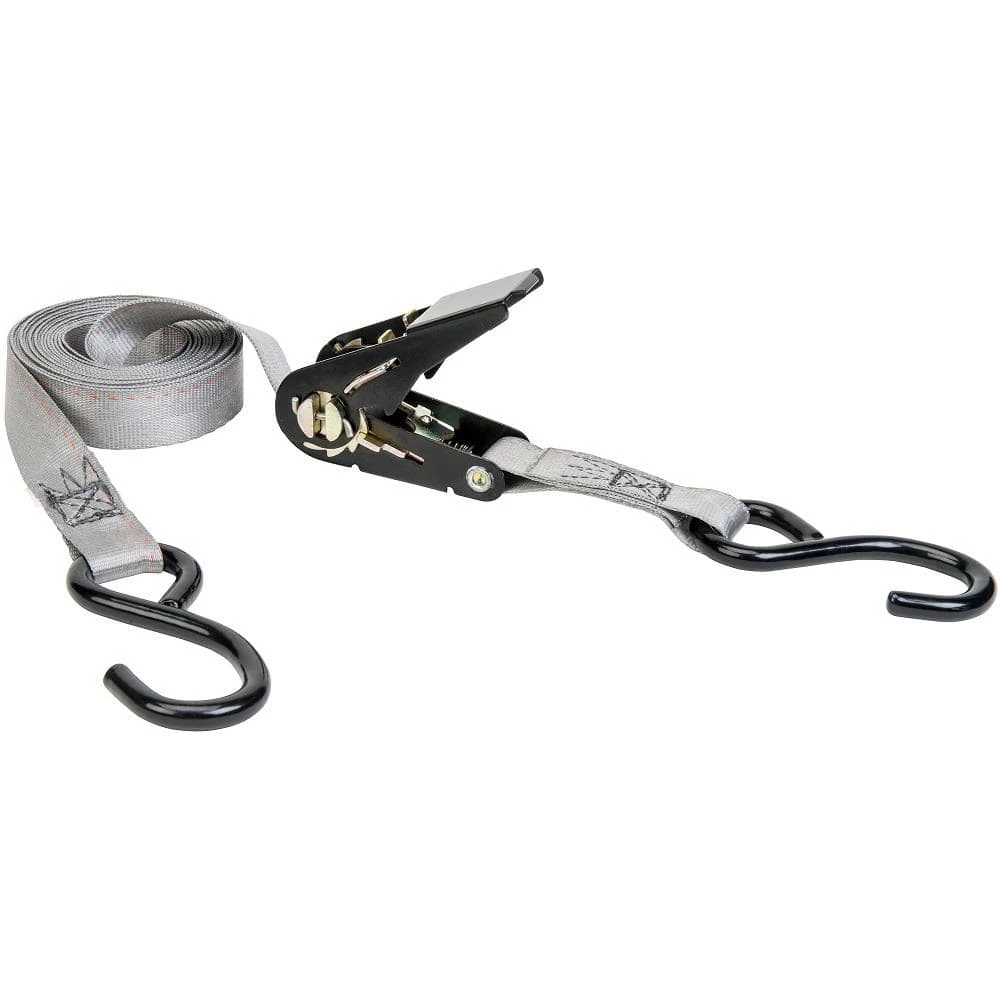The Keeper® 14 ft. High Tension Ratchet Tie-Down features a durable 1 in. Hi-Test® webbing to absorb shock and is corrosion and abrasion-resistant. It is constructed with a metal ratchet and handle, and vinyl-coated S hooks. The ratchet buckle is designed with a rotating gear and lever mechanism latch to tighten and secure your load. To engage attach the hook to an anchor point, pull webbing over cargo load and tug to desired tension. Ratchet by raising and lowering the handle. The webbing then locks cargo into place.