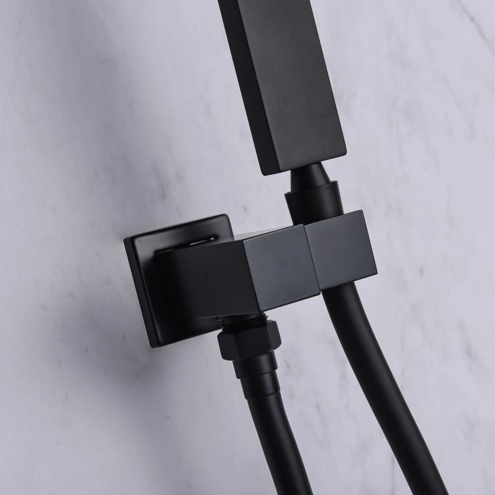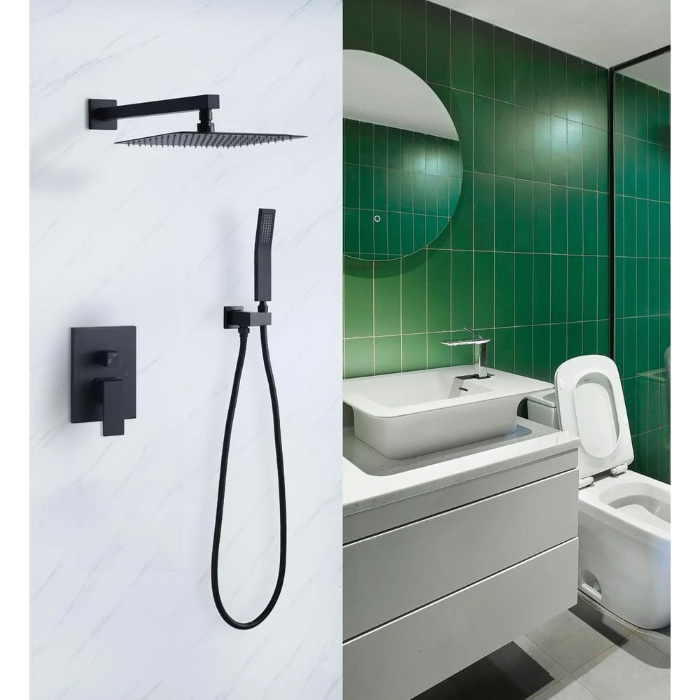 - What You Get — All parts of the rain shower set are made of high-quality materials with professional technology. Those parts include 10-inch square rainfall shower head, handheld shower head, 15-inch shower arm, shower holder, pre-embedded valve, and 60-inch shower hose. The matte black finish and brass combination offers anti- corrosion and classical looking.