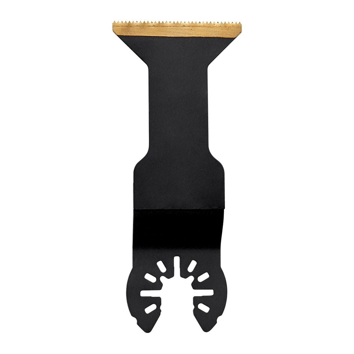 This Bauer™ bi-metal offset blade works with most brands of Multipurpose Oscillating Tools to make clean plunge and flush cuts in metal, plastic, drywall, wood and wood with nails. The blade is capable of plunge cuts to a depth of 1-5/8 in. and features extra sharp titanium coated teeth that cut fast and stay sharp. Ideal for demolition work.
