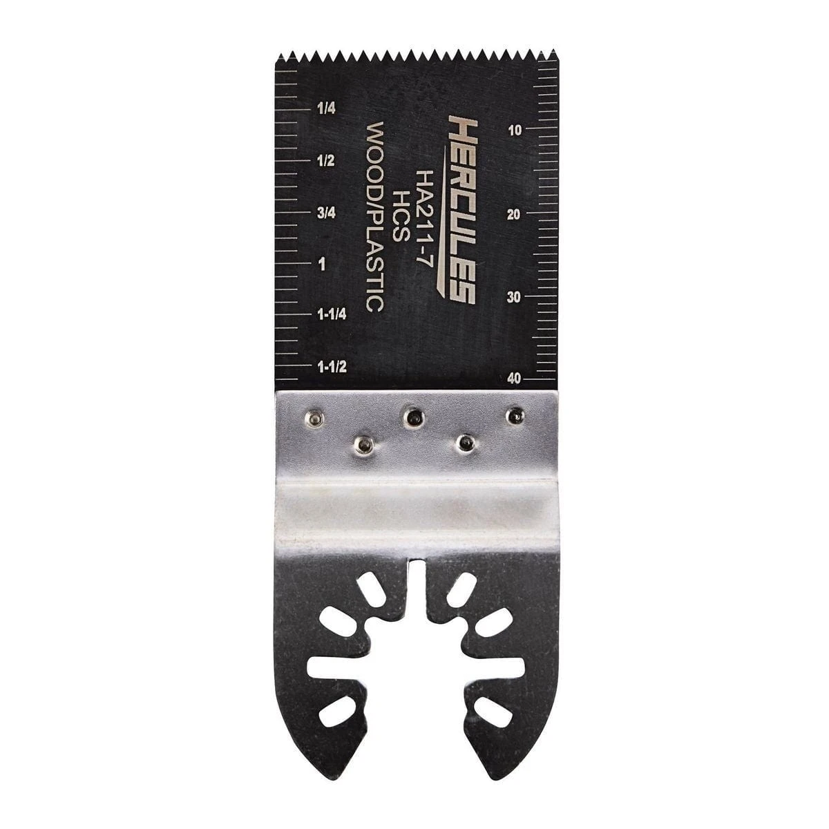 The Hercules® 1-3/8 in. Multi-Tool High Carbon Steel Plunge/Flush Cut Blade is designed with high strength welds to stand up to heavy duty applications. The offset blade is ideal for making clean flush cuts. The precision sharpened high carbon steel teeth stay sharper longer when cutting wood. The blade is laser-etched with depth markings for making precise cuts.