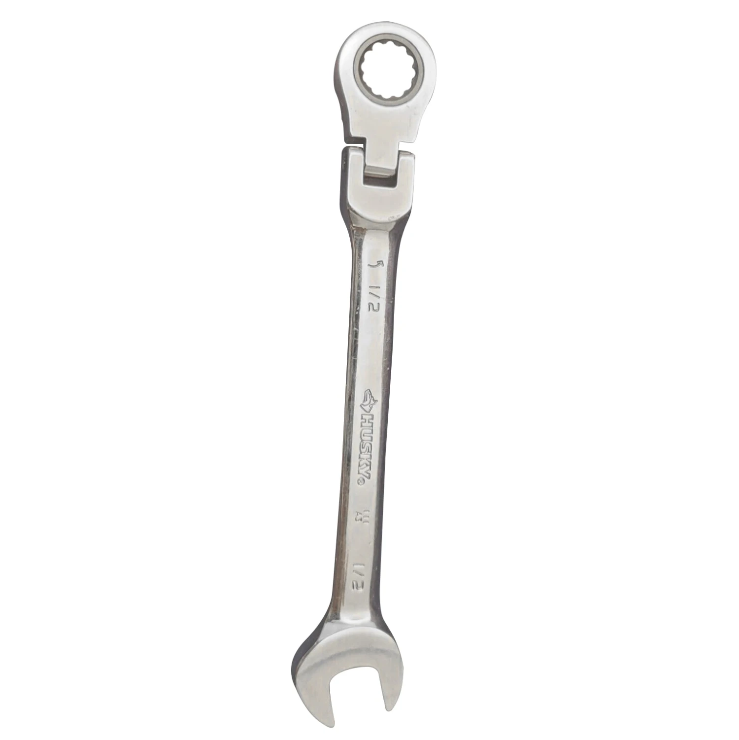 Husky’s flex-head ratcheting combination wrenches feature a 12-point, 72-tooth ratcheting box end that needs only 5° to engage fasteners and a head that pivots 180°. Each wrench is manufactured from Chrome Alloy steel and heat treated for added strength and wear protection; providing durability for a lifetime of hard use. Their polished chrome finish resist rust and corrosion and easily wipes clean of oil and dirt. Both the open and box end features chamfered lead ins for quick and easy placement onto fasteners every time.